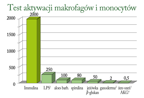 Porównano immulinę z lipopolisacharydami (LPS), które są składnikami ściany bakterii Escherichia coli. Immulina 8-krotnie skuteczniej stymuluje odporność niż lipopolisacharydy Escherichia coli oraz 20 razy niż aloes i 25 razy niż spirulina z której pochodzi. Immulina aż 40 razy stymuluje odporność w porównaniu z tradycyjnymi preparatami takimi, jak jeżówka (echinacea) i ß-glukan. Preparaty zawierające ekstrakty reishi i żeń-szenia amerykańskiego praktycznie wykazują jedynie śladową aktywność w porównaniu z immuliną.